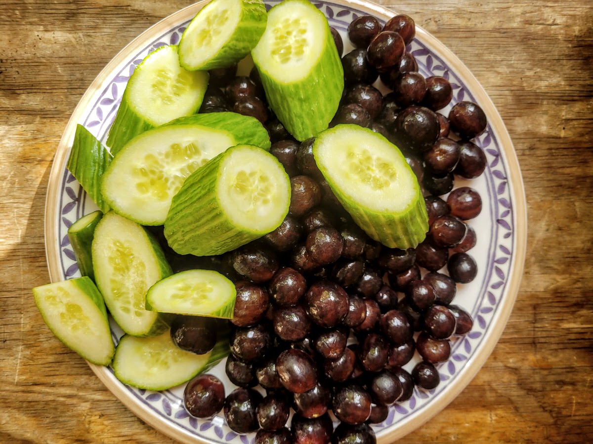 Weintrauben wurden übrigens bereits vor 5.000 Jahren im alten Ägypten gegessen und sie gehören zu den kalorienhaltigsten Obstsorten. Das gleichen wir aber mit einer Gurke wieder aus, denn die besteht zu etwa 97 Prozent aus Wasser. Ihre Nährstoffe sitzen hauptsächlich in der Schale. Deswegen lieber nur abwaschen, anstatt sie zu schälen und - das gilt auch für die Trauben - auf Bioanbau achten. Außer Wasser wären da noch ein bisschen Kohlenhydrate sowie sehr geringe Mengen Eiweiße und Fette zu nennen. An Vitaminen enthält die Gurke -wie die Traube - Vitamine aus der B-Gruppe und Vitamin C und E. An Mineralstoffen bietet sie Kalzium, Zink, Eisen, Magnesium, Kalium und Phosphor. Das ähnelt der Traube - bis auf den Zink, den wir z.B. für schöne Haut brauchen.