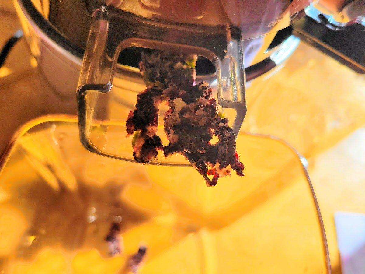 Wir haben kernlose Trauben genommen, um das Sieb des Entsafters zu schonen. Kerne könnten es reißen lassen. Kernlose haben zwar nicht so viele sekundäre Pflanzen- und andere Nährstoffe. Denn die sind hauptsächlich in den Kernen. Aber im Fruchtfleisch steckt immer noch genug davon. Unter anderem reichlich Kalium - wichtig unter anderem für die Herzfunktion, den Blutkreislauf sowie für Zellen, Nerven und Muskeln. In den Trauben steckt auch Kalzium und Magnesium. Kalzium macht starke Knochen und Zähne. Magnesium brauchen wir für die Muskeln und unseren Energiehaushalt. Nicht zu vernachlässigen ist auch ihr Gehalt an Folsäure, die sehr wichtig für unseren Stoffwechsel ist.