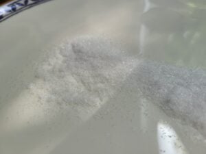 - Beide Essigsorten, den grob gewürfelten Ingwer und die halbierten Knoblauchzehen (beide vorher schälen) mit einem Deckel drauf zum Kochen bringen. Am besten bei geöffnetem Fenster, weil die Essig-Chili-Dämpfe es ganz schön in sich haben. 2-4 Minuten köcheln lassen, dann auf kleine Flamme stellen und Zucker und Salz einrühren.