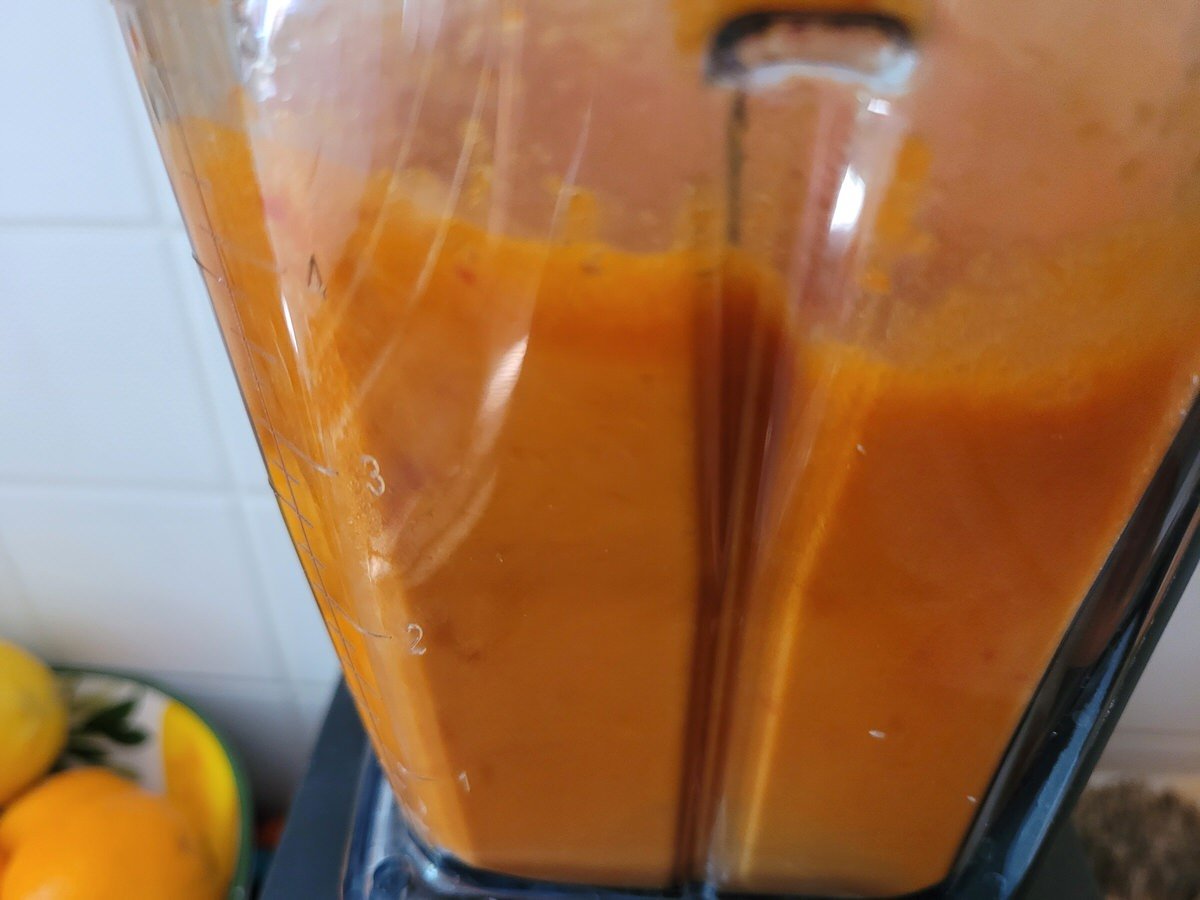 - Noch 1-2 Minuten köcheln lassen. Dann alles in den 2 l oder 1,4 l Behälter von Vitamix oder entsprechenden von Bianco oder Blendtec geben und zu einer sehr leuchtendroten Soße pürieren.