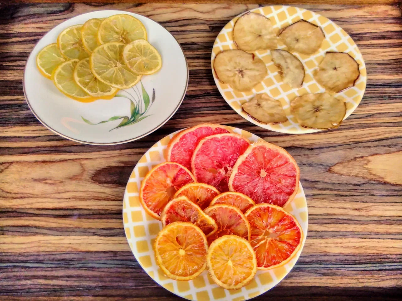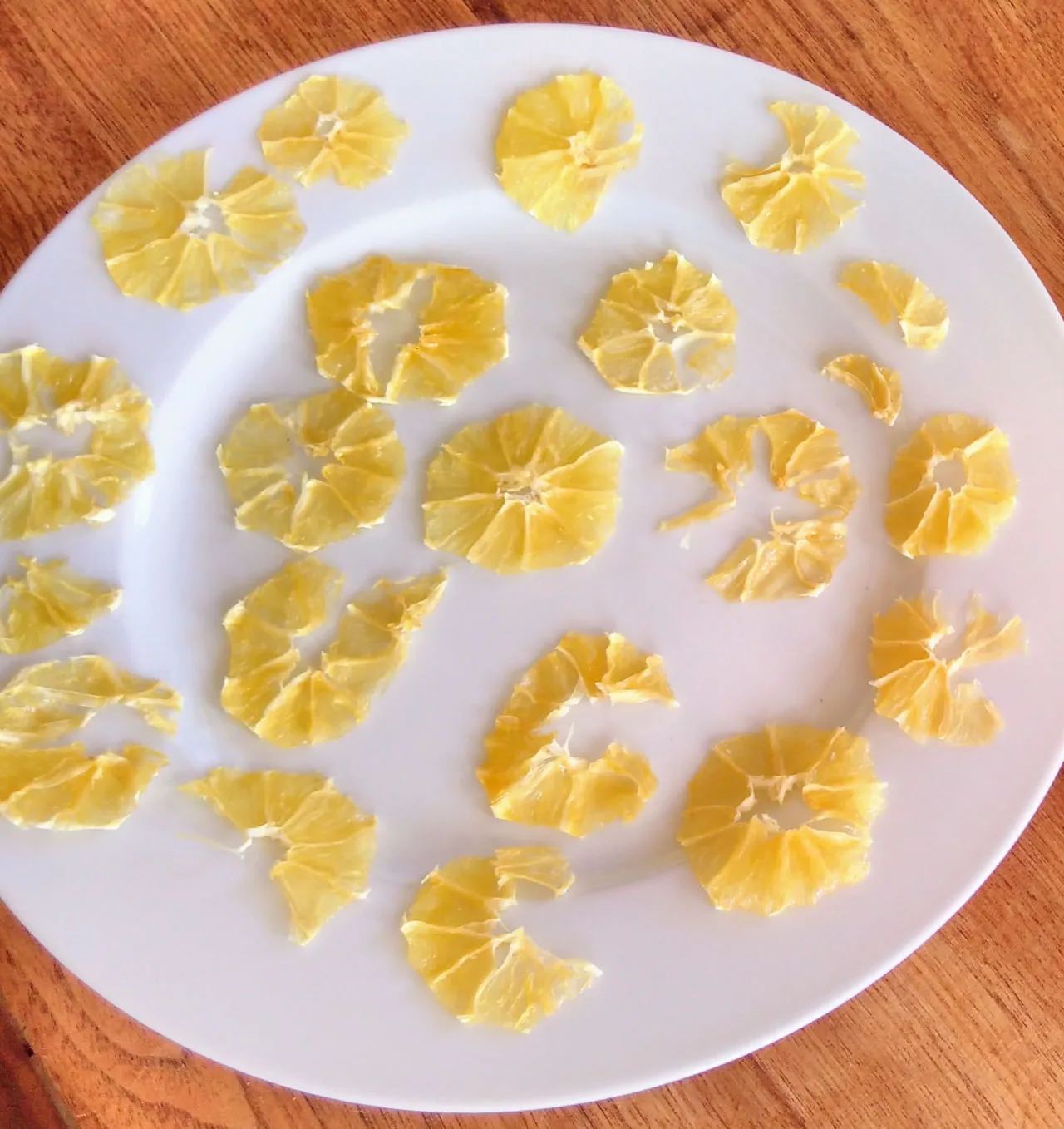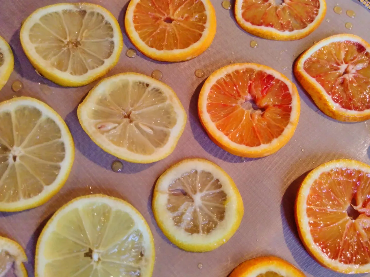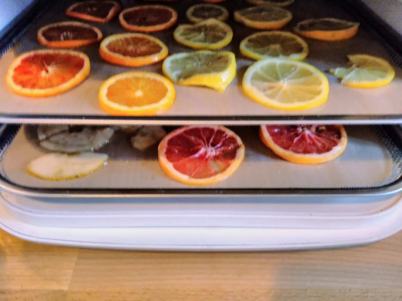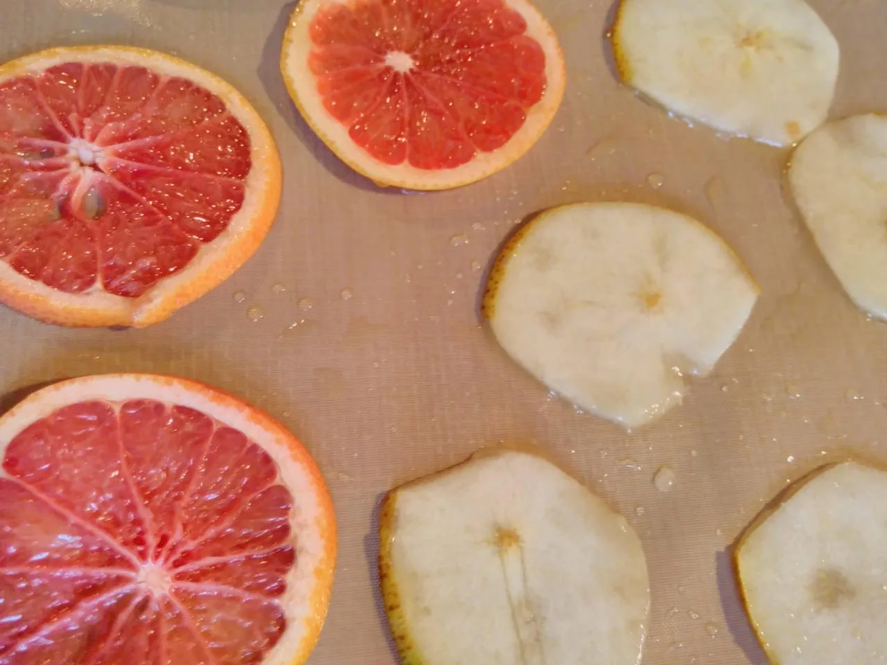 Das habe ich mal bei einem gelb-grünen Dinner im schönen Gutshaus Lexow an der Müritz so gemacht. Die Früchte werden mit Ahornsirup glasiert. Das ist meines Wissens das Einzige, was Sachen im Dörrautomaten ‚knusprig‘ macht. Ich hatte Glück, es gab gerade Blutsaftorangen. Die sehen natürlich besonders schön aus. Aber auch die rosa Grapefruit! Die hat mir übrigens am besten geschmeckt. Benutzen kann man die glasierten Früchte unter anderem zum Dekorieren von Salat, Smoothie oder Süßspeisen. Oder man verputzt sie als Snack einfach so. Das habe ich mit den Birnen gemacht. Und werde es gleich auch mit den restlichen Zitrusfrüchten tun.