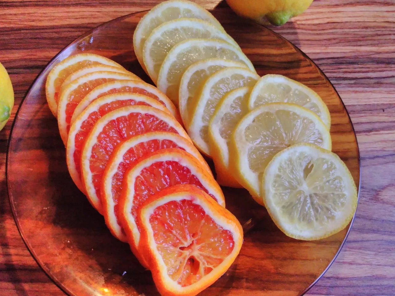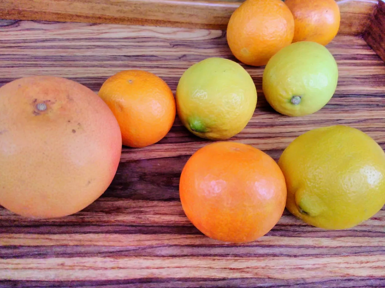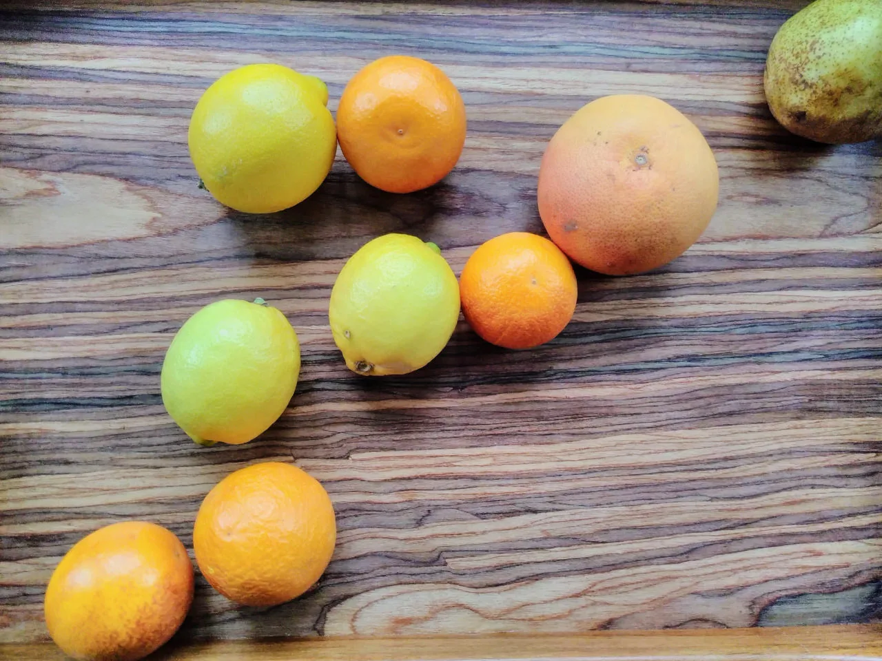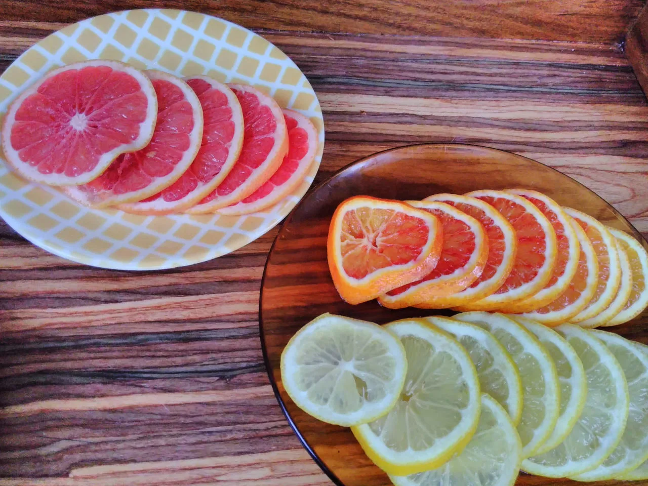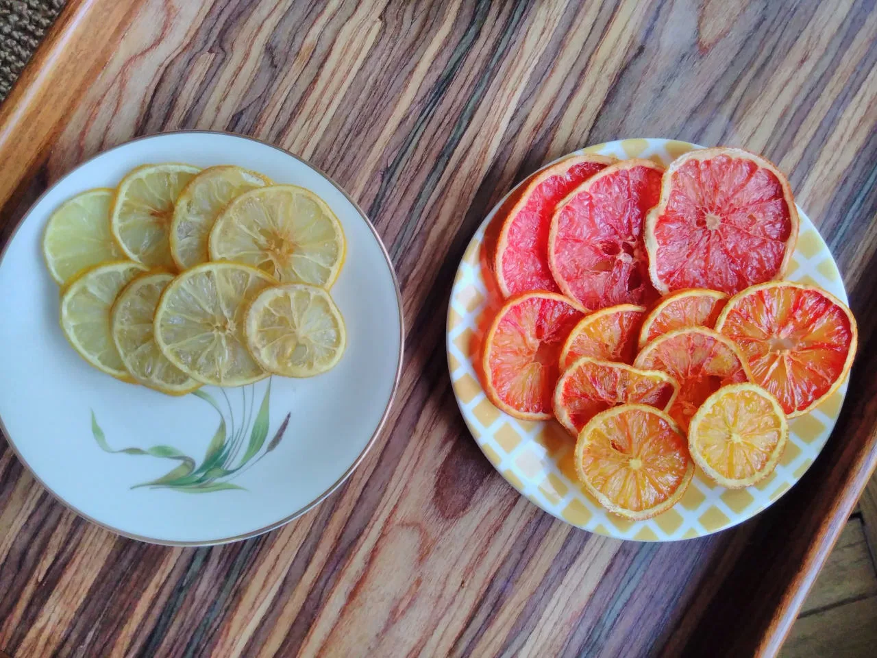 Das habe ich mal bei einem gelb-grünen Dinner im schönen Gutshaus Lexow an der Müritz so gemacht. Die Früchte werden mit Ahornsirup glasiert. Das ist meines Wissens das Einzige, was Sachen im Dörrautomaten ‚knusprig‘ macht. Ich hatte Glück, es gab gerade Blutsaftorangen. Die sehen natürlich besonders schön aus. Aber auch die rosa Grapefruit! Die hat mir übrigens am besten geschmeckt. Benutzen kann man die glasierten Früchte unter anderem zum Dekorieren von Salat, Smoothie oder Süßspeisen. Oder man verputzt sie als Snack einfach so. Das habe ich mit den Birnen gemacht. Und werde es gleich auch mit den restlichen Zitrusfrüchten tun.