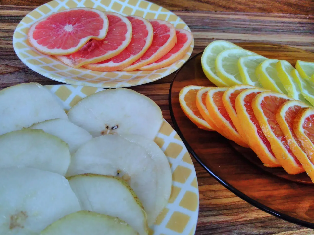 Das Obst waschen und mit einem Gemüsehobel oder einem scharfen Messer in möglichst dünne Scheiben schneiden.