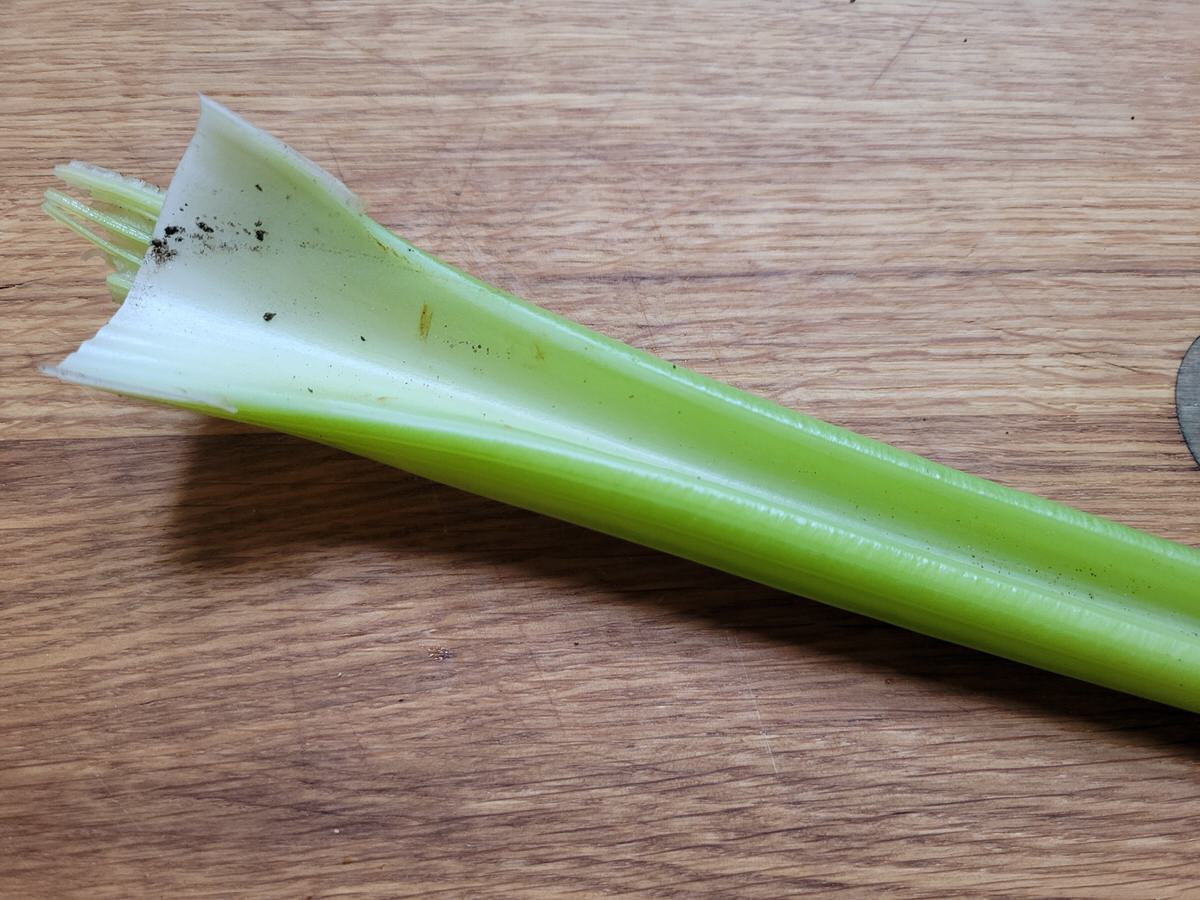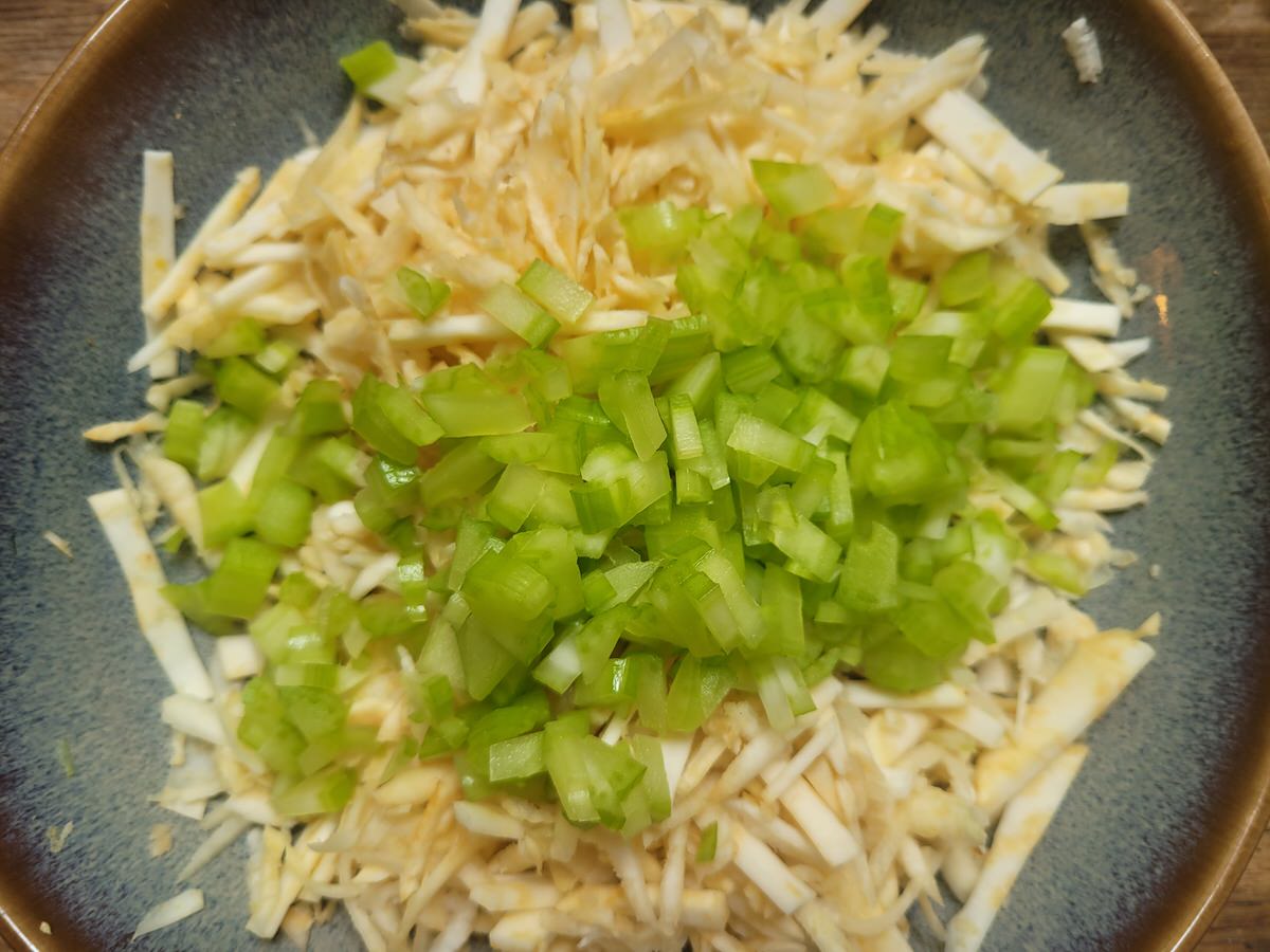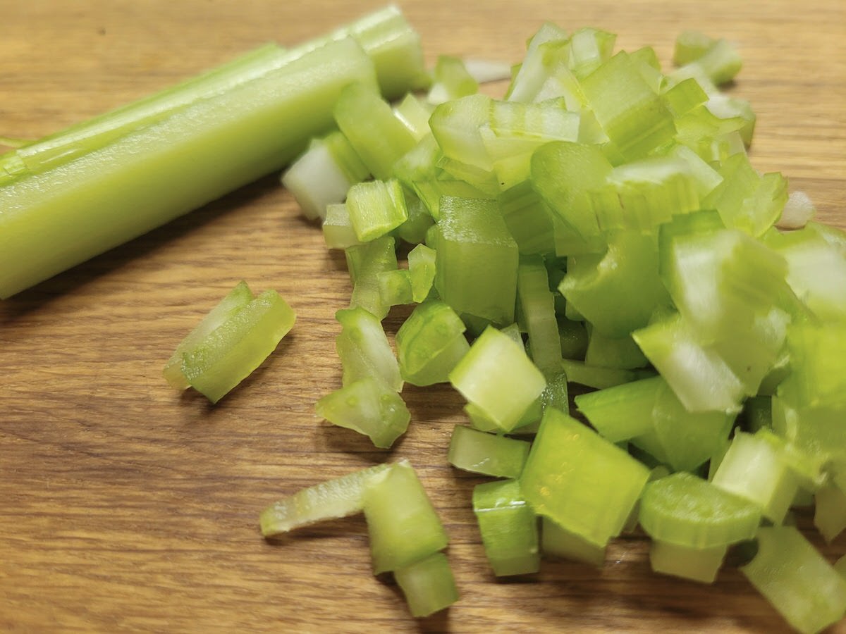 - 60 g Staudensellerie in Streifen und dann in feine Würfel schneiden. In die Schüssel geben.
