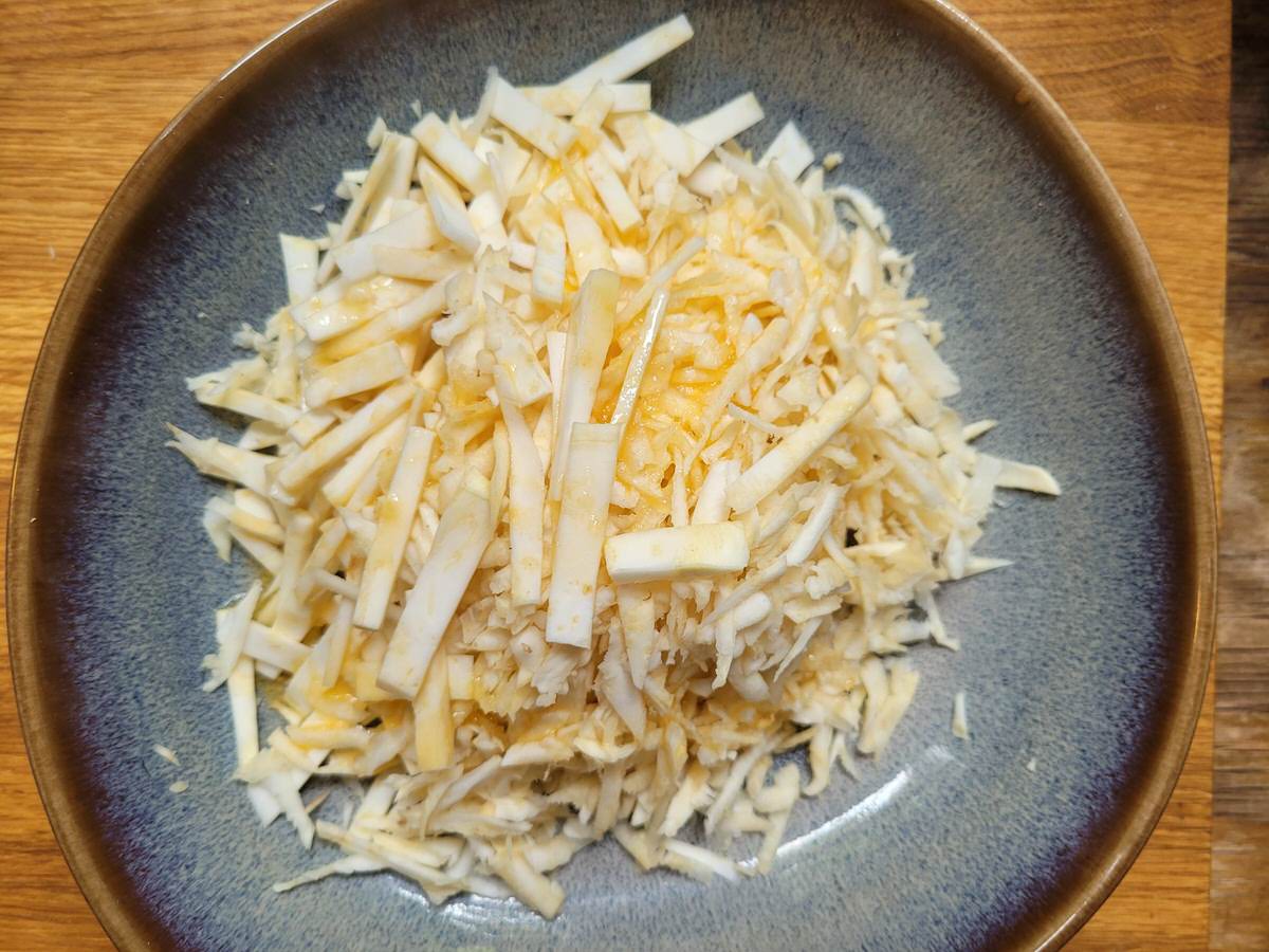 - Knollensellerie in Scheiben schneiden, schälen und dann entweder im food processor raspeln oder mit dem Messer in feine Stifte schneiden. Oder mit der groben Seite einer Vierkantreibe raspeln.