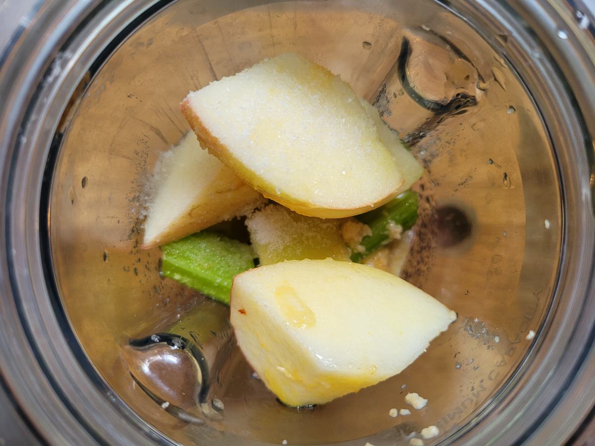 - Für das Dressing, den klein geschnittenen Apfel, die geviertelte Schalotte, 30 g Staudensellerie in groben Stücken, das Öl, Salz, den Meerrettich, sowie den Rest der ausgepressten Saftorange in z.B. den 900 ml Behälter vom Vitamix Ascent geben (den funkelnagelneuen Schutzbehälter, der vor ein paar Tagen aus den USA kam, habe ich damit nun eingeweiht!) und zu einer sämigen Soße pürieren.