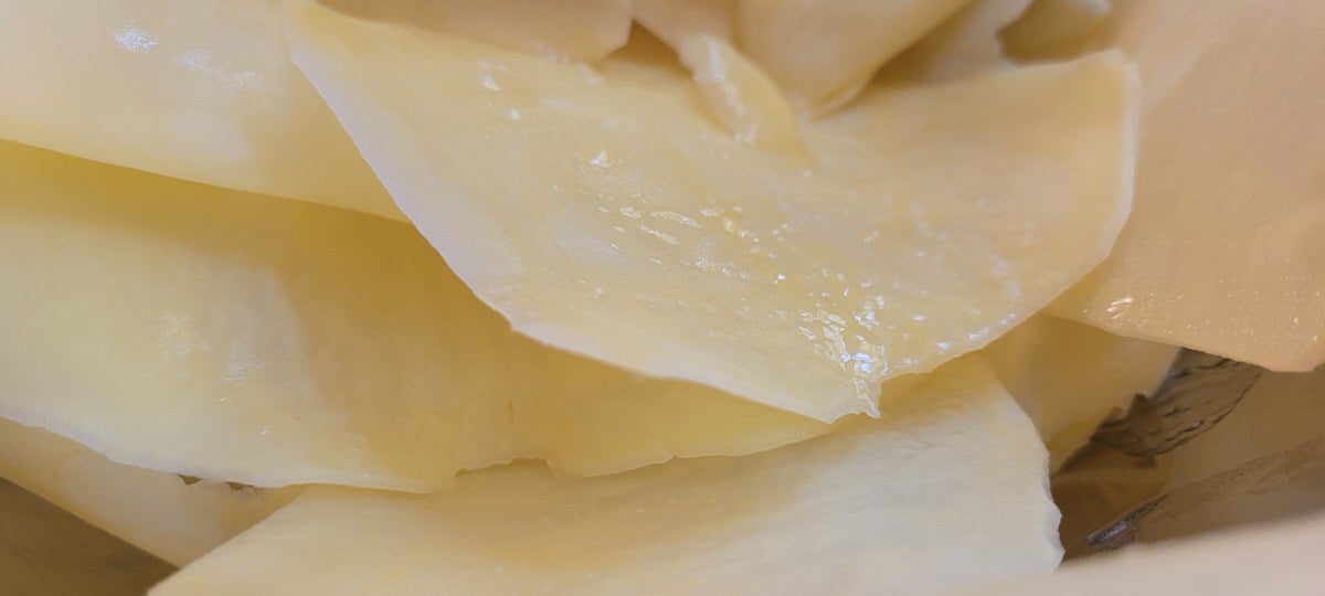 Am Vortag die Kartoffeln schälen und mit der Mandoline in dünne Scheiben oder dem Gemüseblattschneider in dünne Blätter verarbeiten. Sofort in kaltes Wasser geben, damit sie nicht anlaufen, bis die Butter samt dem Rosmarin in einem Töpfchen oder einer Pfanne geschmolzen ist. Die Kartoffeln abgießen, auf ein frisches Geschirrtuch geben und trocken tupfen. In eine große Schüssel umfüllen, die geschmolzene Butter darüber gießen, die 3 große Prisen Salz dazu und alles vorsichtig, aber gründlich vermischen.