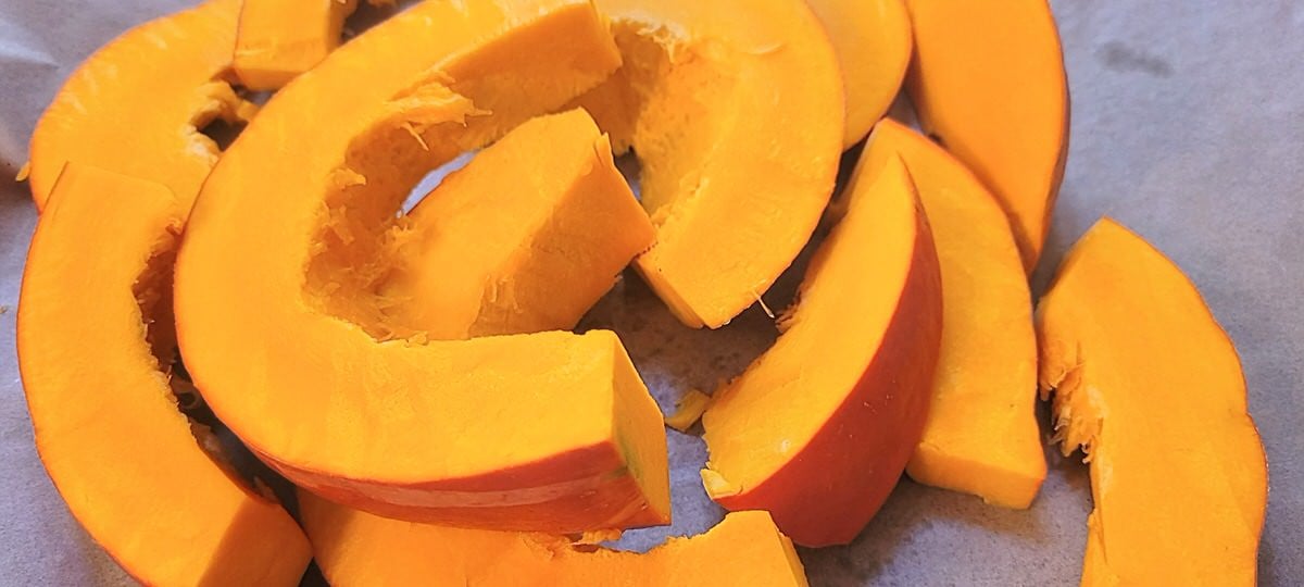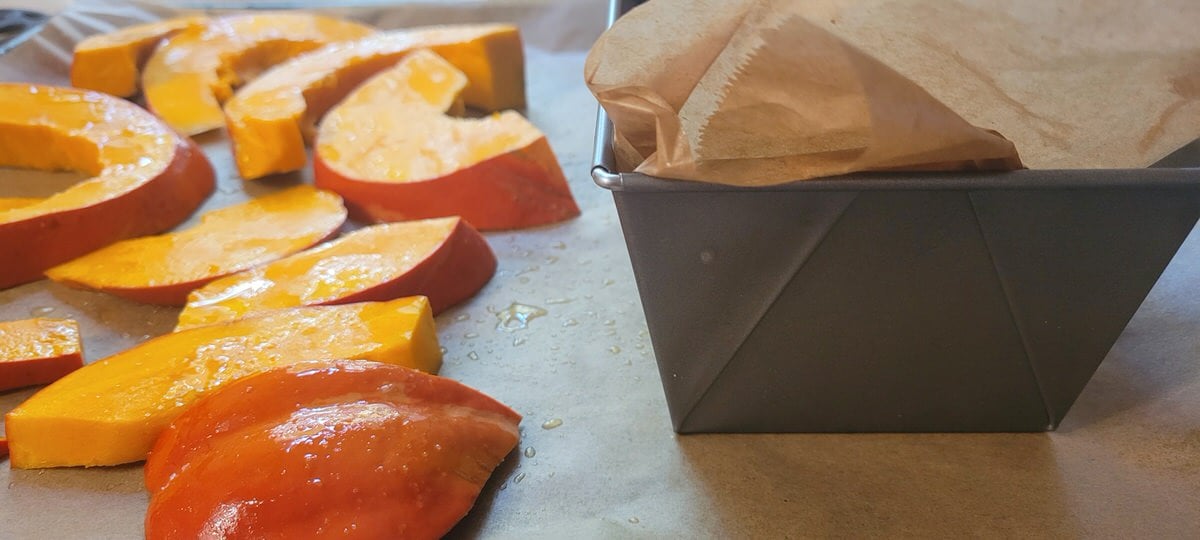 Den Kürbis ebenfalls am Vortag putzen und in grobe Stücke schneiden. Mit etwas Olivenöl und Salz mischen und auf ein Backblech geben, so dass noch Platz für die Kastenform mit den Kartoffeln bleibt. Beides gemeinsam in den Ofen schieben. Nach 25-30 Minuten ist der Kürbis gar. Rausholen, abkühlen lassen und bis zur Weiterverarbeitung in den Kühlschrank stellen.