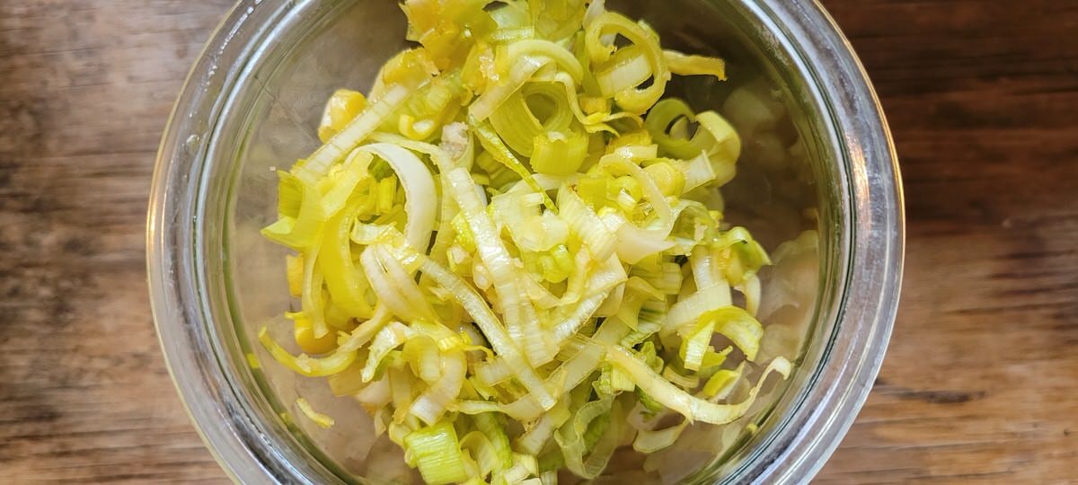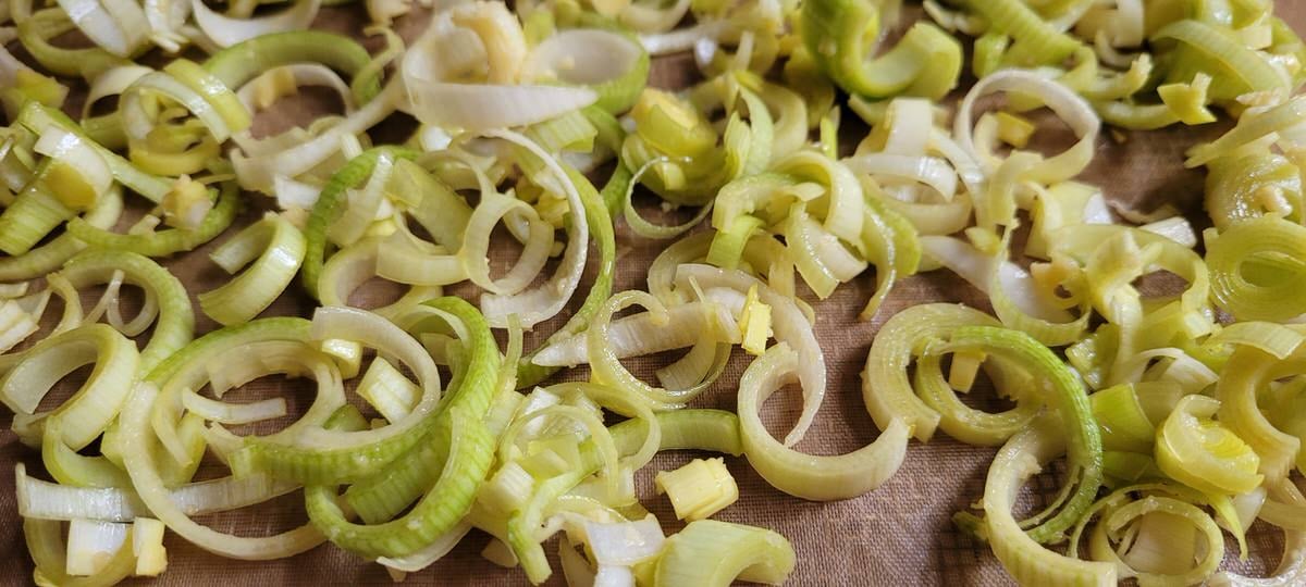 Den Lauch putzen, waschen, der Länge nach halbieren und in dünne Scheiben schneiden. Mit den restlichen Zutaten für das Topping gründlich vermischen, auf ein mit einer Dörrfolie ausgelegtem Blech gleichmäßig verteilen und bei 42° im Sonnen- oder Windmodus 2 Stunden aromatisieren lassen.