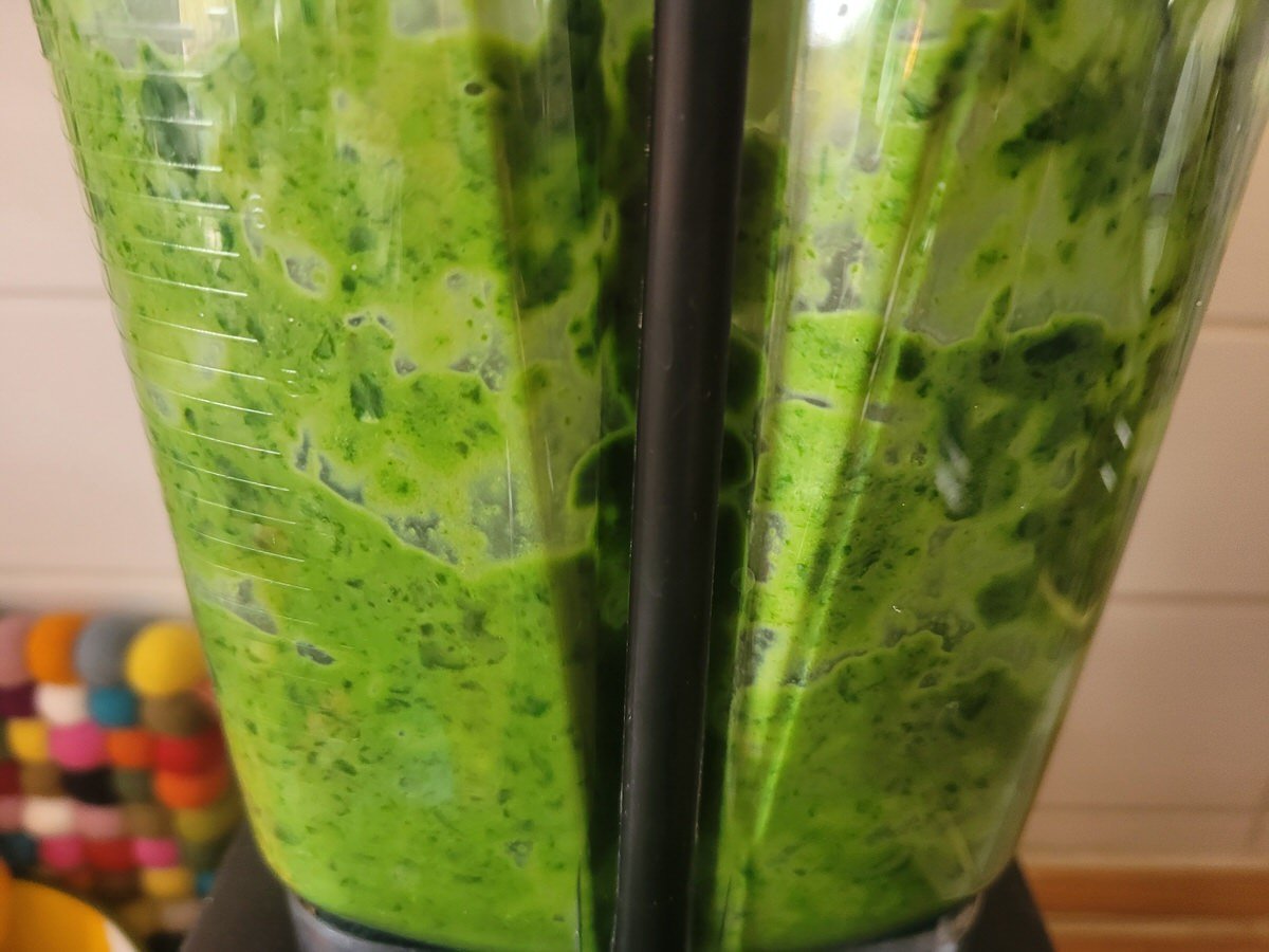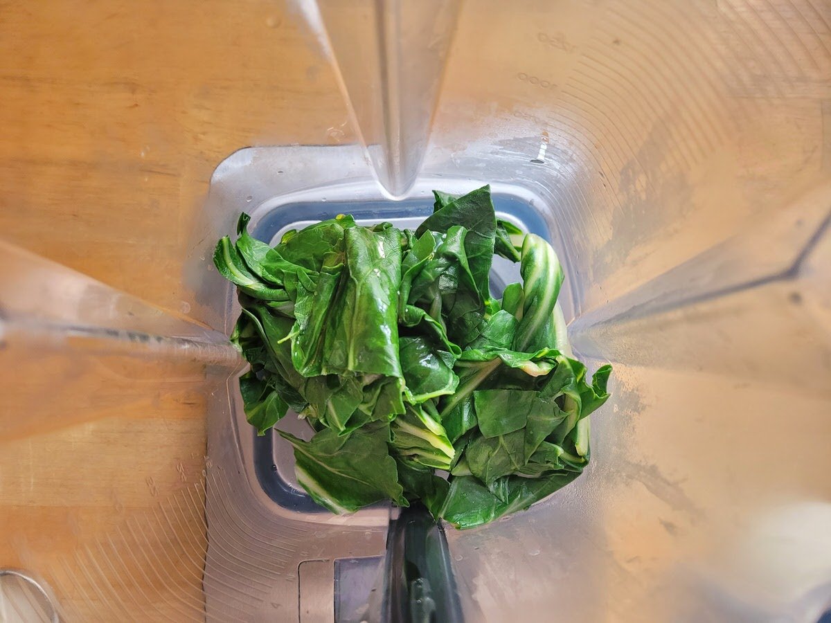 - Den geputzten und gewaschenen Mangold (Reste und Strünke anderweitig verwenden) mit dem Öl, dem Wasser und der Pflanzenmilch in den 2 l oder 1,4 l Behälter von Vitamix oder entsprechenden von Bianco oder Blendtec geben und zu einer schönen, homogenen knallgrünen Soße pürieren.