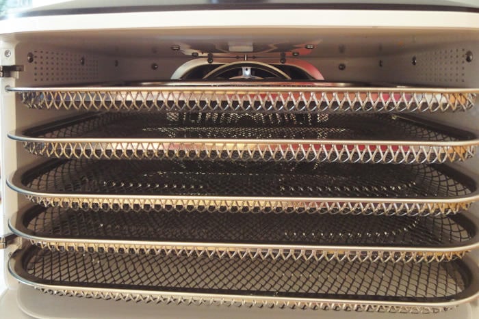 Die robusten Dörrgitter bestehen aus Edelstahl und können bei Bedarf mit einer Dörrfolie belegt werden. Ob dies notwendig ist, hängt von den jeweiligen Lebensmitteln ab. Bei der Herstellung von Gemüsechips hat sich gezeigt, dass häufig auf Folien verzichtet werden kann.