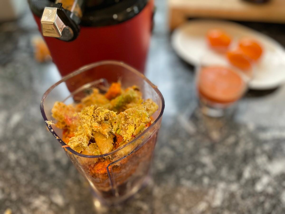 Im Test haben wir reichlich Ingwer, Kurkuma, Paprika, Petersilie, Fenchel, Zitrone (auch mit Schale), Möhren, rote Beete, Orangen & Äpfel entsaftet. Das Verarbeiten ging sehr zügig und klappte hervorragend. Am Ende hatten wir eine große Menge an Saft extrahiert.