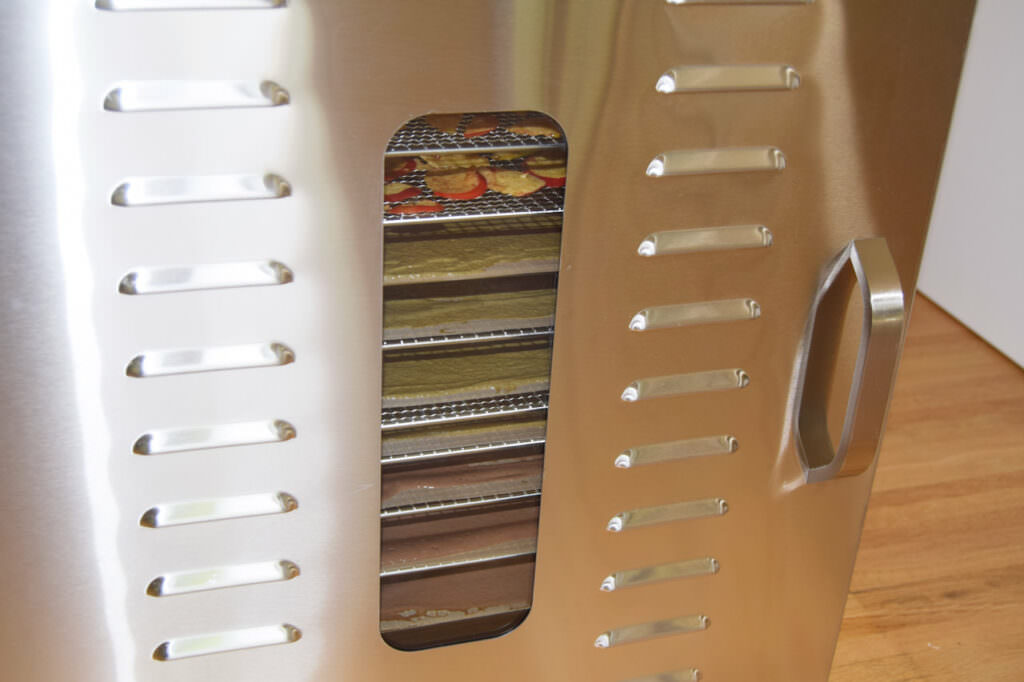 Die Montage des Griffs vor der ersten Nutzung geht schnell von der Hand. Besonders beeindruckt hat uns die hochwertige Verarbeitungsqualität des robusten Edelstahlgehäuses und der Dörreinschübe. Die Gittereinschübe sind mit ca. 7 mm quadratischen Öffnungen ideal dimensioniert, sodass auch kleineres Dörrgut gut gehalten wird und kaum durchfällt. Für feines Dörrgut empfehlen sich ergänzende Dörrfolien.