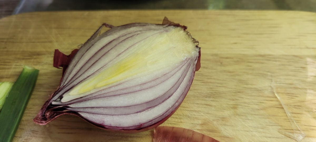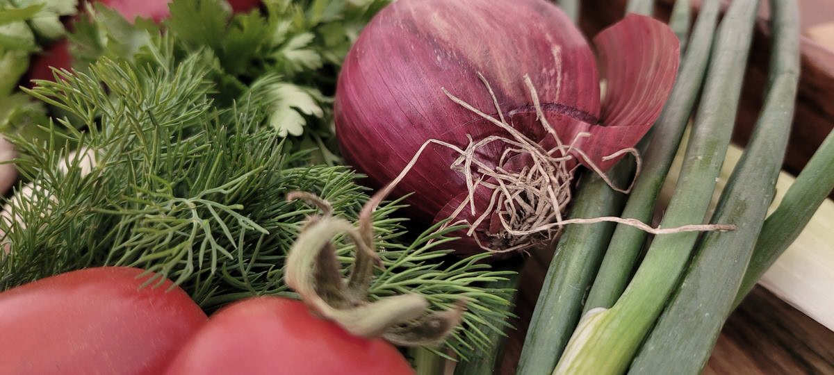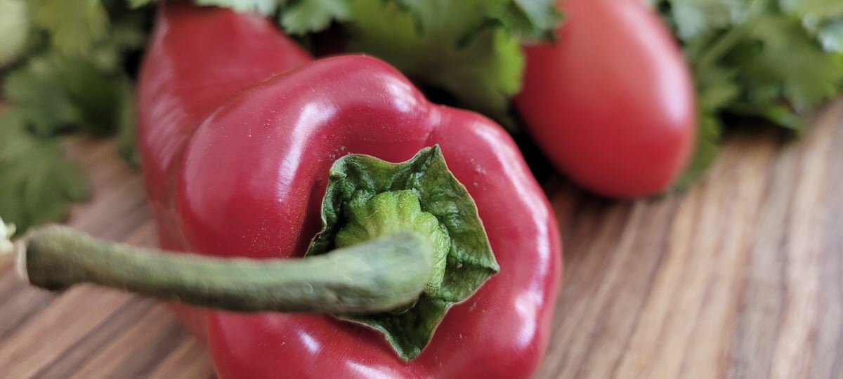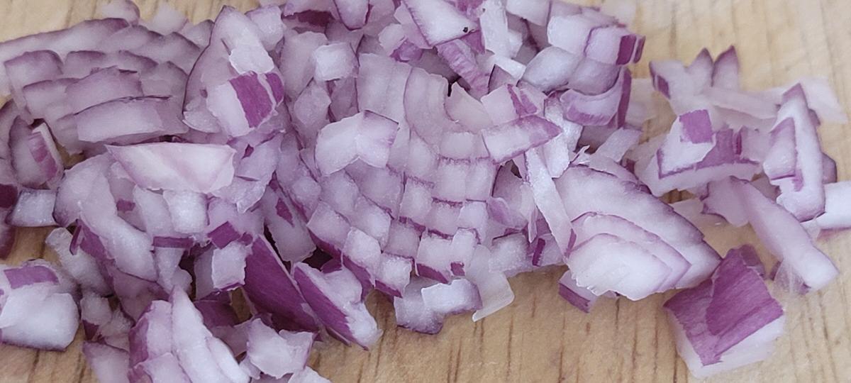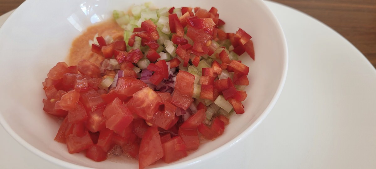 - Die kleingeschnittenen roten Zwiebeln, Paprika, Sellerie und die 3. Datteltomate sowie 1 Handvoll Koriander (ergab gehackt 3 gute Teelöffel) unterrühren und abschmecken.