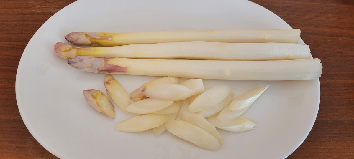 - Die Spargel schälen und schräg in dünne Scheiben schneiden.