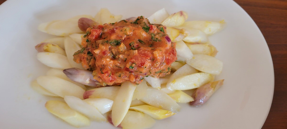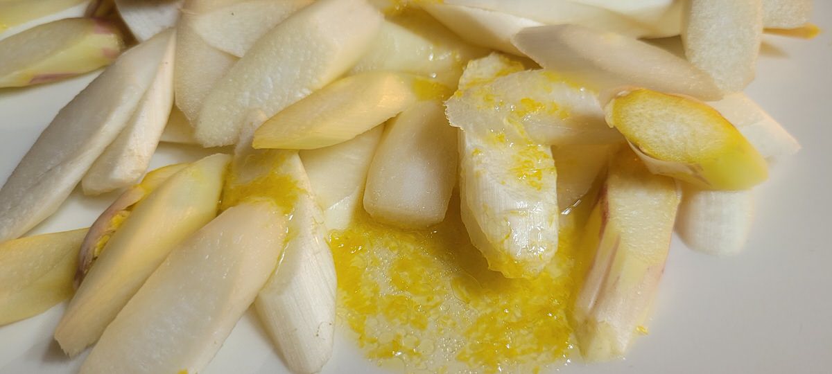 - Die Spargelscheiben auf einen Teller geben, einen ordentlichen Klacks Dressing darauf geben.