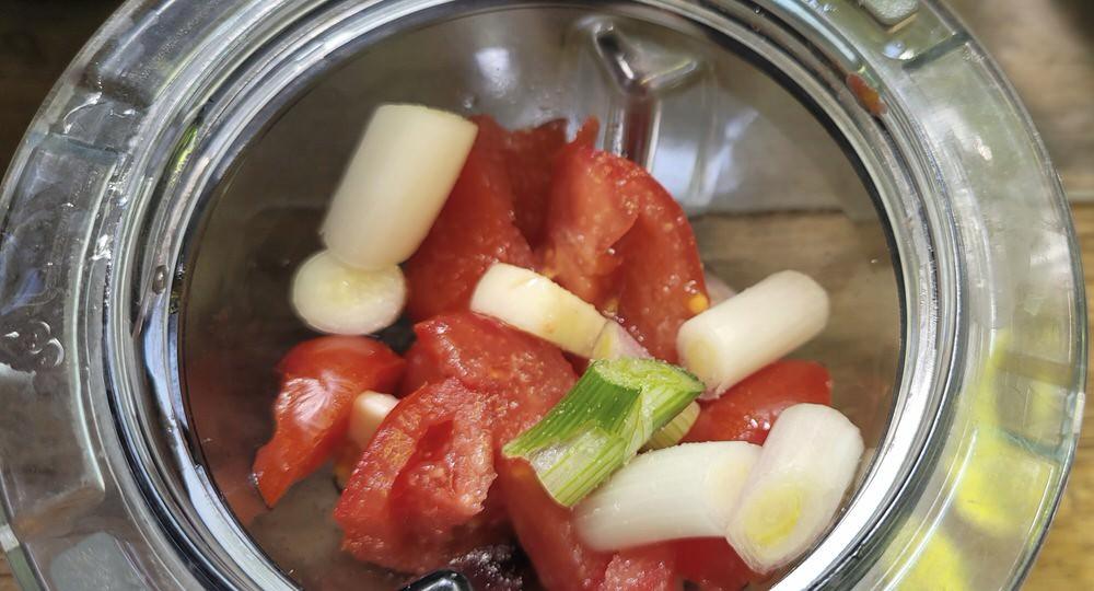 - Für das Dressing 2 halbierte Datteltomaten, die sehr kleine Knoblauchzehe, den weißen Teil der Frühlingszwiebel, Öl und Salz im kleinsten Aufsatz von Vitamix, Blendtec oder Bianco zu einem relativen homogenen Dressing pürieren.
