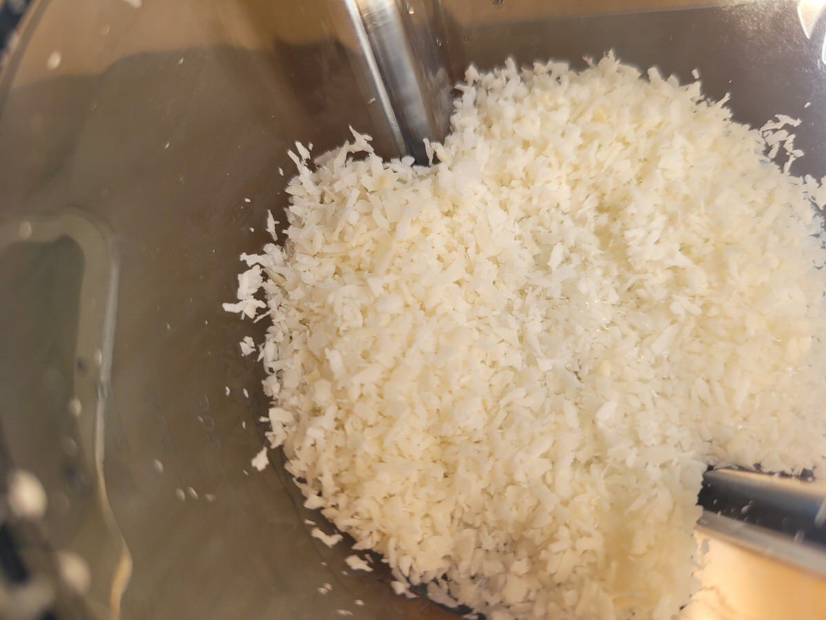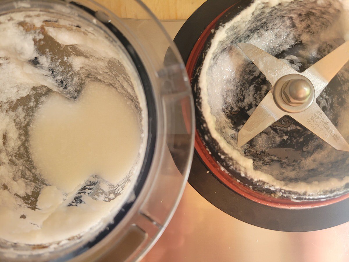 Kokosraspeln und 80 ml Wasser im kleinsten Behälter von Vitamix, Blendtec oder Bianco geben - ich habe den kleinen Aufsatz vom Vitamix Ascent benutzt - und kurz und kräftig zu einer Kokosmilch pürieren.