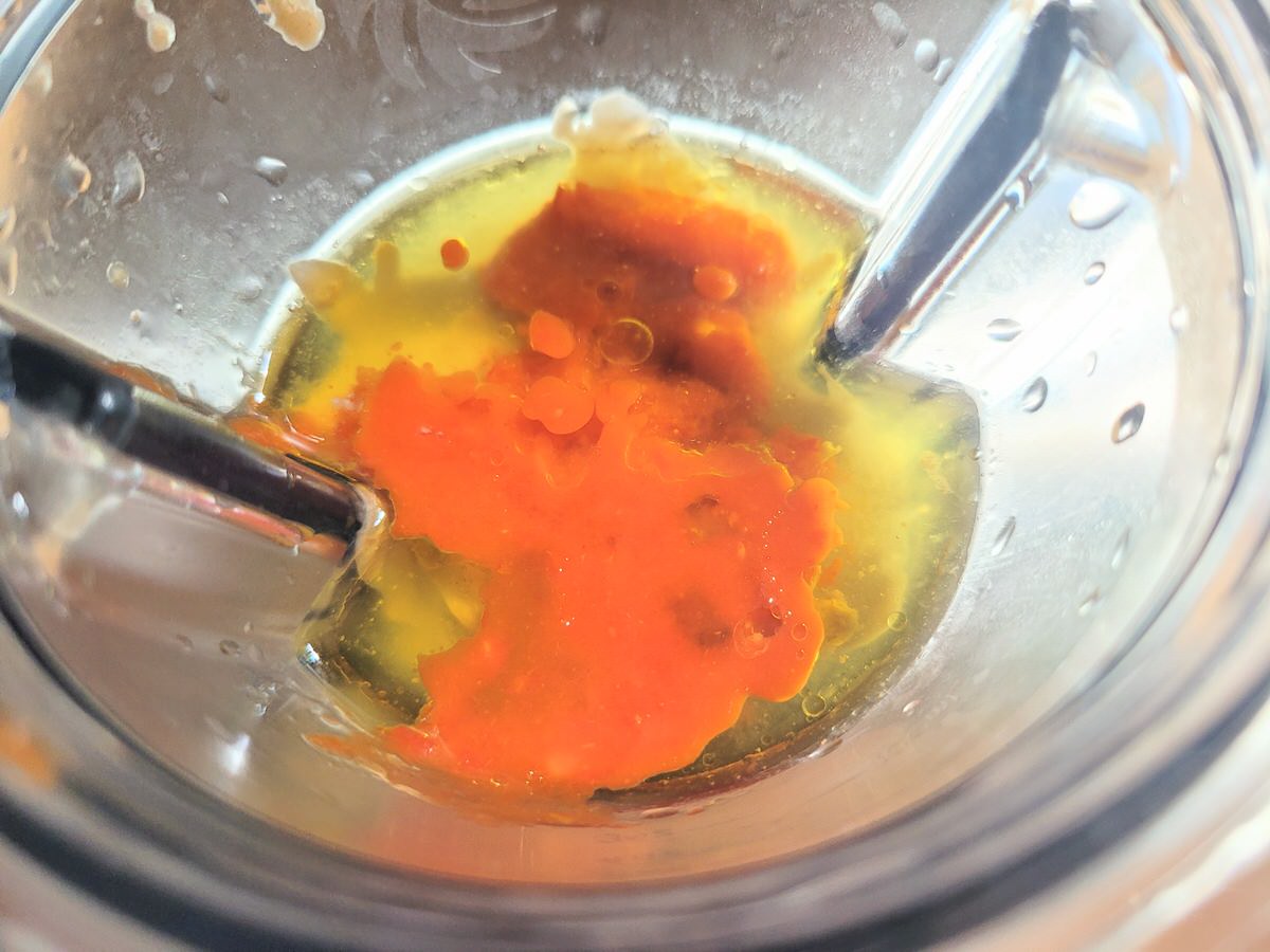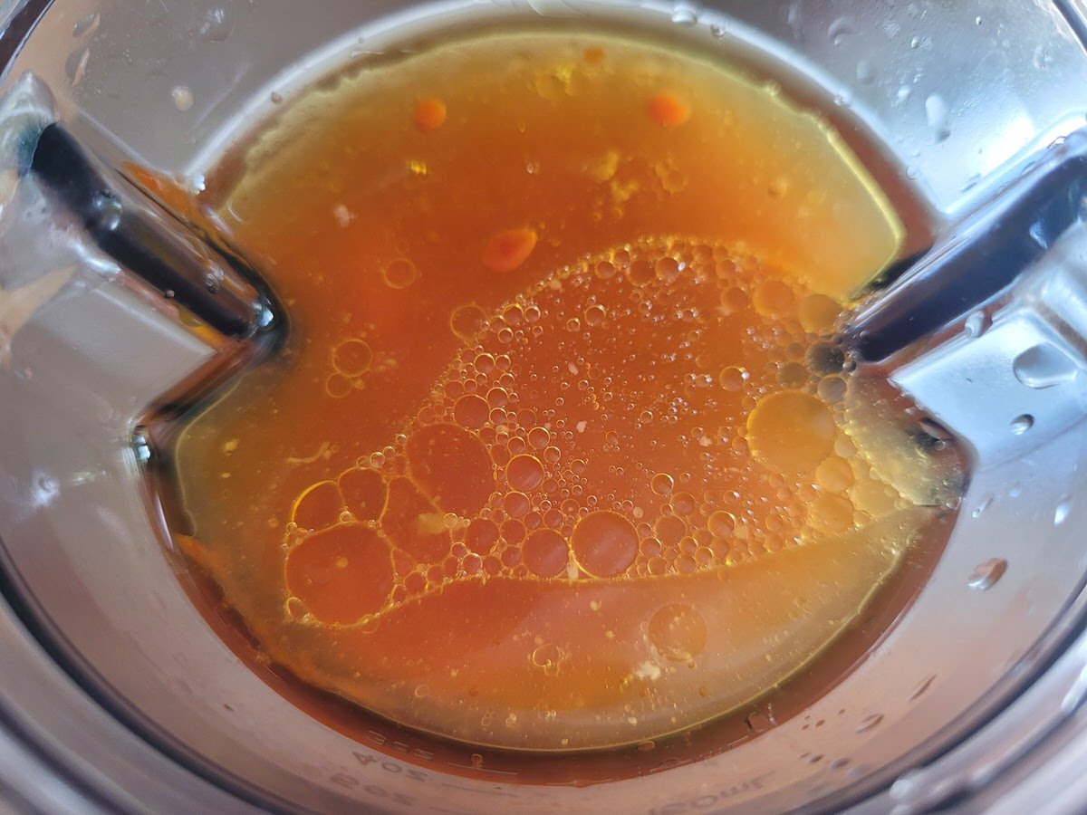 Alle Zutaten in den kleinsten Behälter von Vitamix, Blendtec oder Bianco geben - ich habe den kleinen Aufsatz vom Vitamix Ascent benutzt - und zu einer homogenen Soße pürieren.