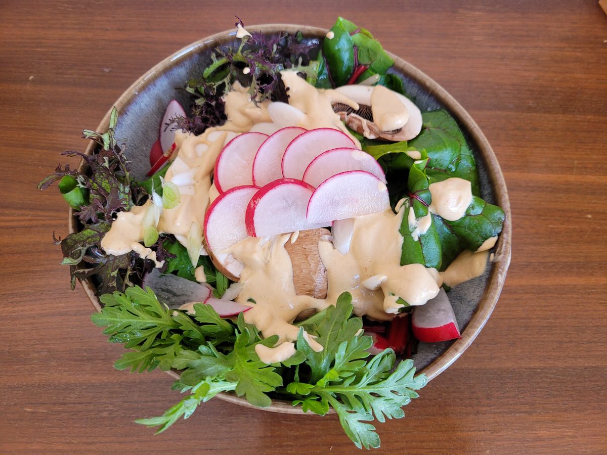 Variante 1, eine Sriracha-Tahini-Soße, passt zum Beispiel - wie hier auf den Fotos zu sehen - auf einen gemischten Salat. Ob mit oder ohne Kichererbsen oder anderen Hülsenfrüchten. Oder auf ein Tomatencarpaccio, zu Rohkost-Tacos oder als Dip zu Rohkost-Gemüsesticks. Passt aber auch auf ein Paprikarisotto als Topping. Oder in ein Nudelgericht.