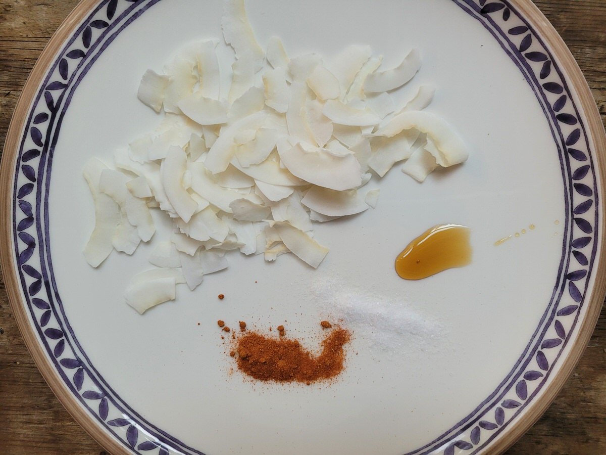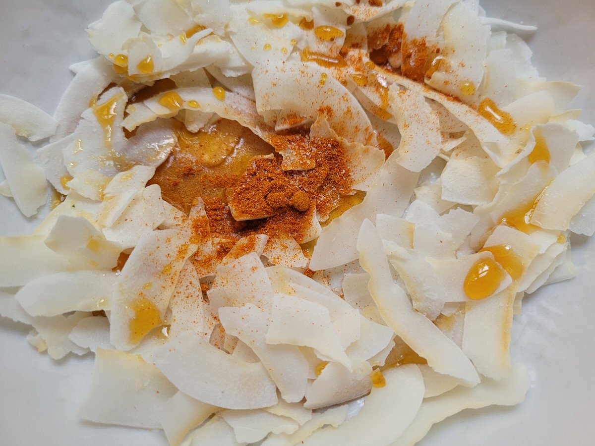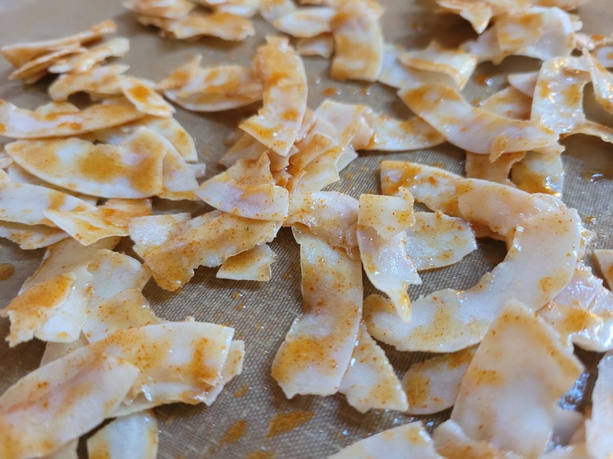 - Die Kokoschips mit Ahornsirup und Paprikapulver vermischen und auf ein mit Dörrfolie ausgelegtes Blech verteilen.