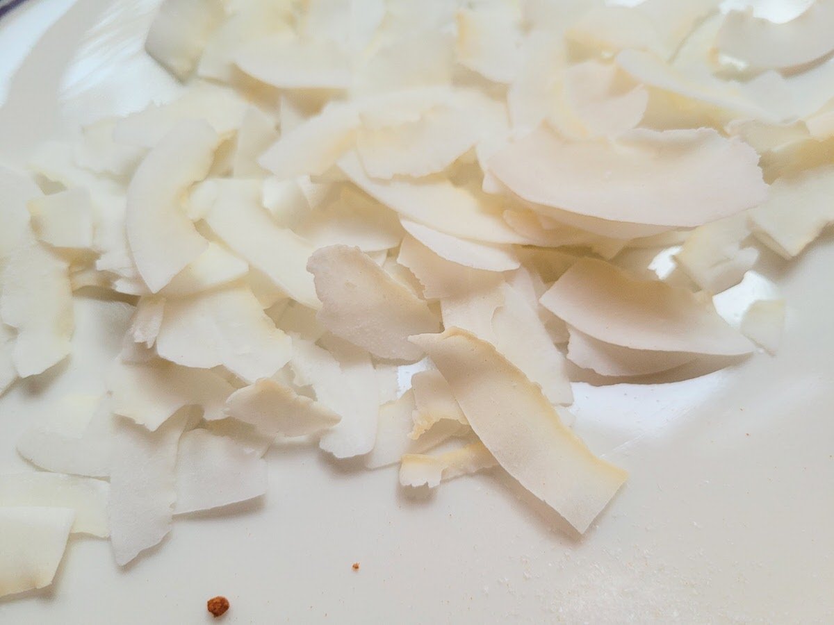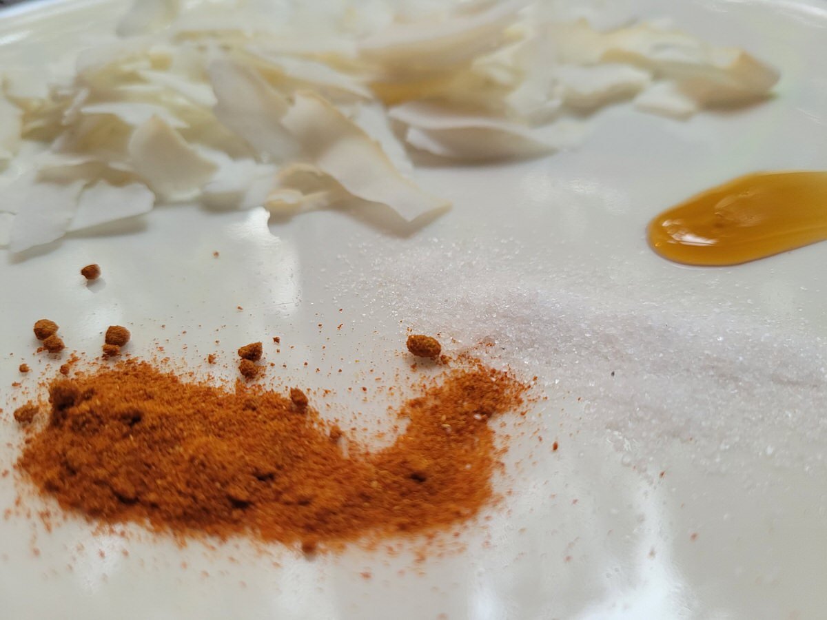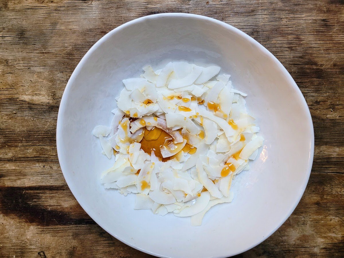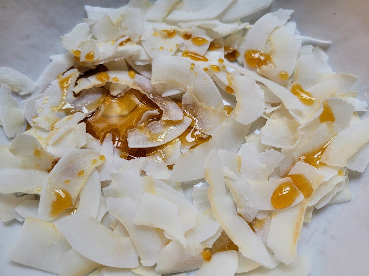 - Die Kokoschips mit Ahornsirup und Paprikapulver vermischen und auf ein mit Dörrfolie ausgelegtes Blech verteilen.