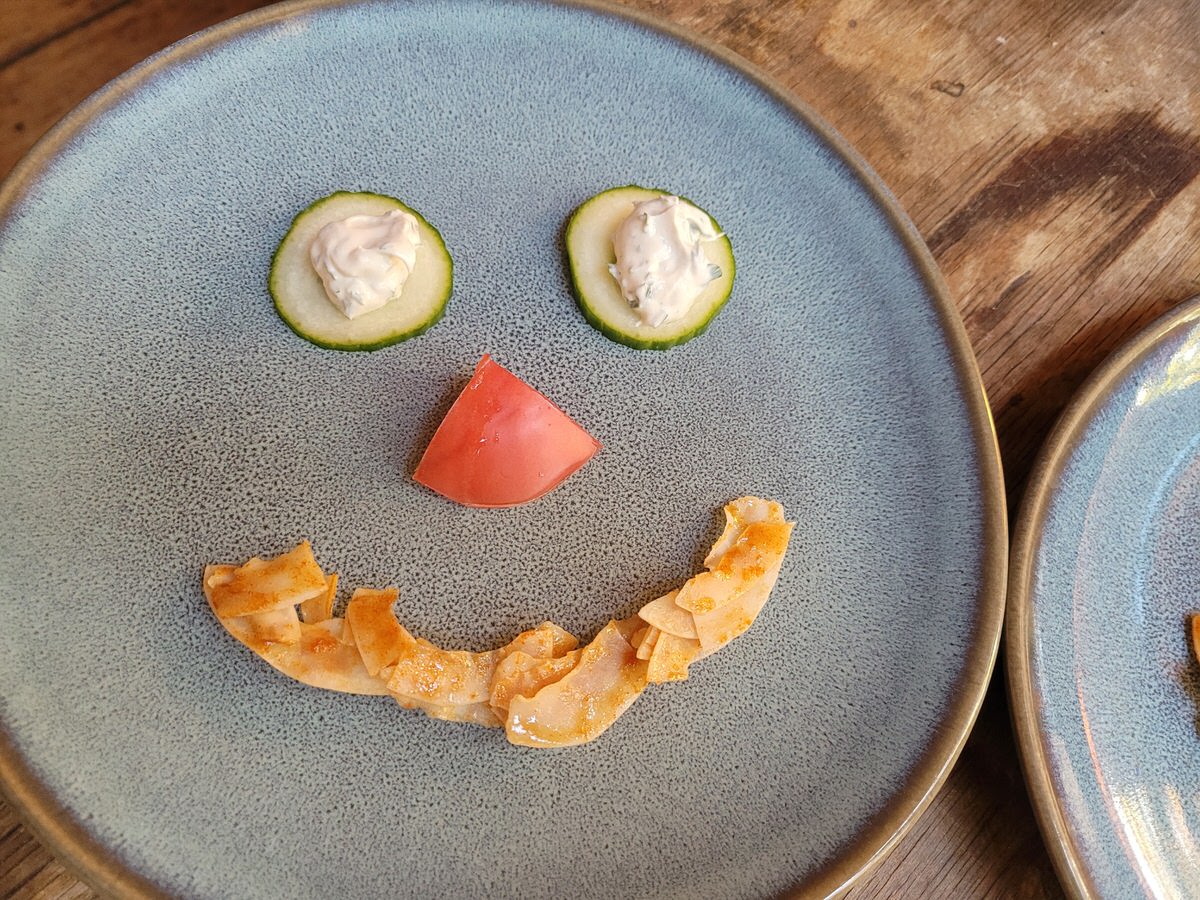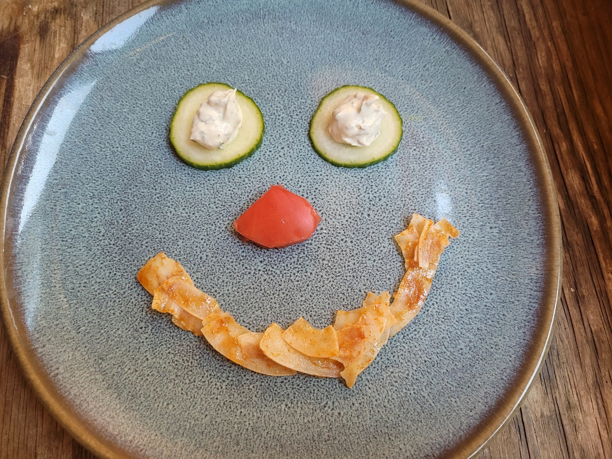 - Für die Nase eine halbe Cherrytomate oder ein Stück einer anderen Tomate oder rote Paprika mit der Schnittfläche nach unten auf den Teller legen.