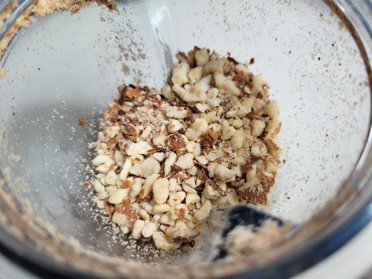 - Die Mandel im kleinsten vorhandenen Behälter des Vitamix, Blendtec oder Bianco auf Stufe 5 im Pulsmodus oder immer nur für 3 Sekunden bis zur gewünschten Größe zerkleinern.