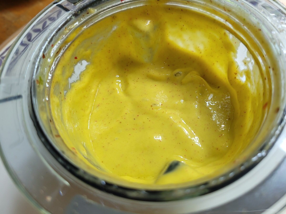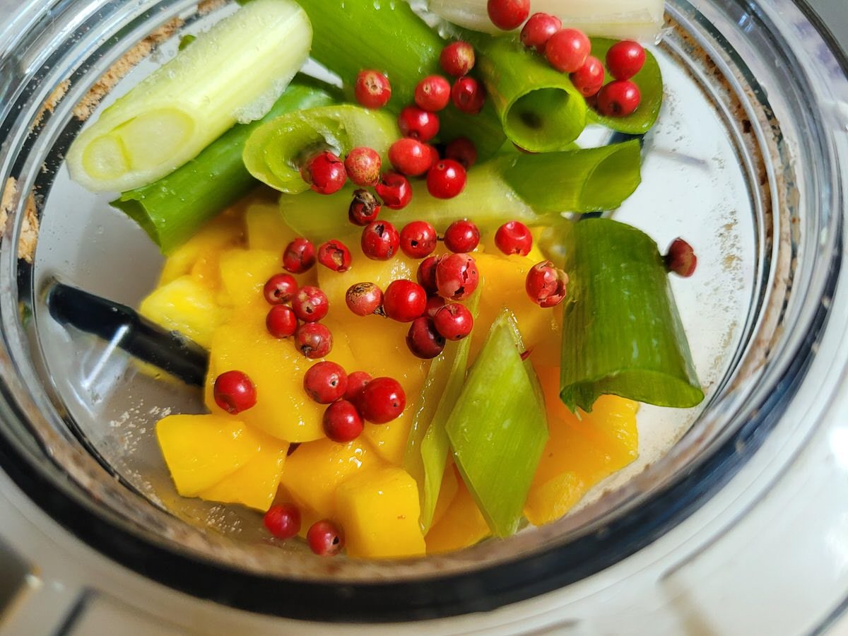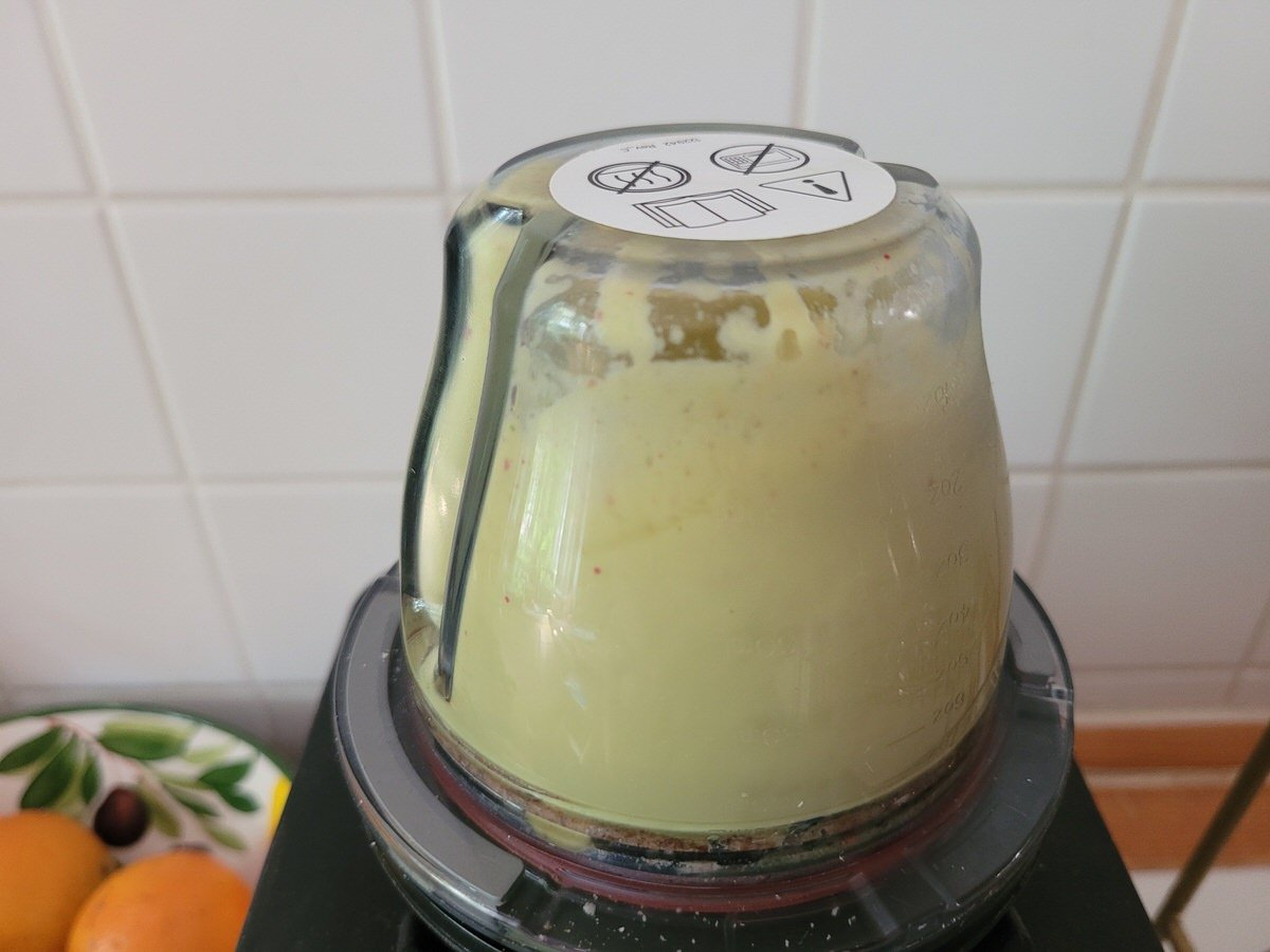 - Während die Mandeln abkühlen, für die Salsa alle Zutaten im selben Behälter zu einer glatten leuchtenden Creme pürieren. In ein hübsches Schüsselchen umfüllen und bis zur Verwendung in den Kühlschrank stellen.