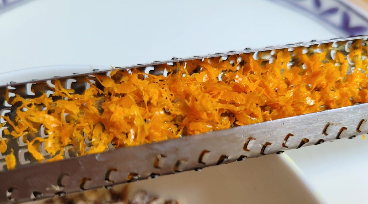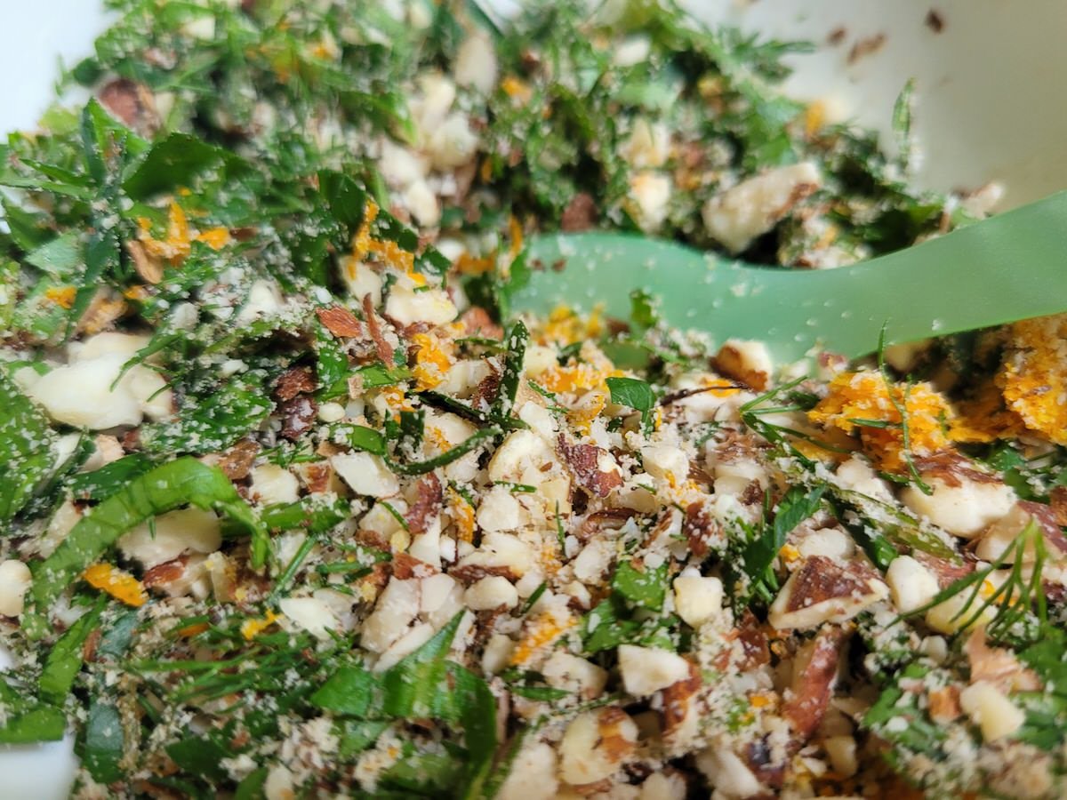 - Für die Gremolata die Kräuter fein hacken, und mitsamt den Mandeln und der abgeriebenen Orangenschale in einer Schüssel gründlich vermischen.