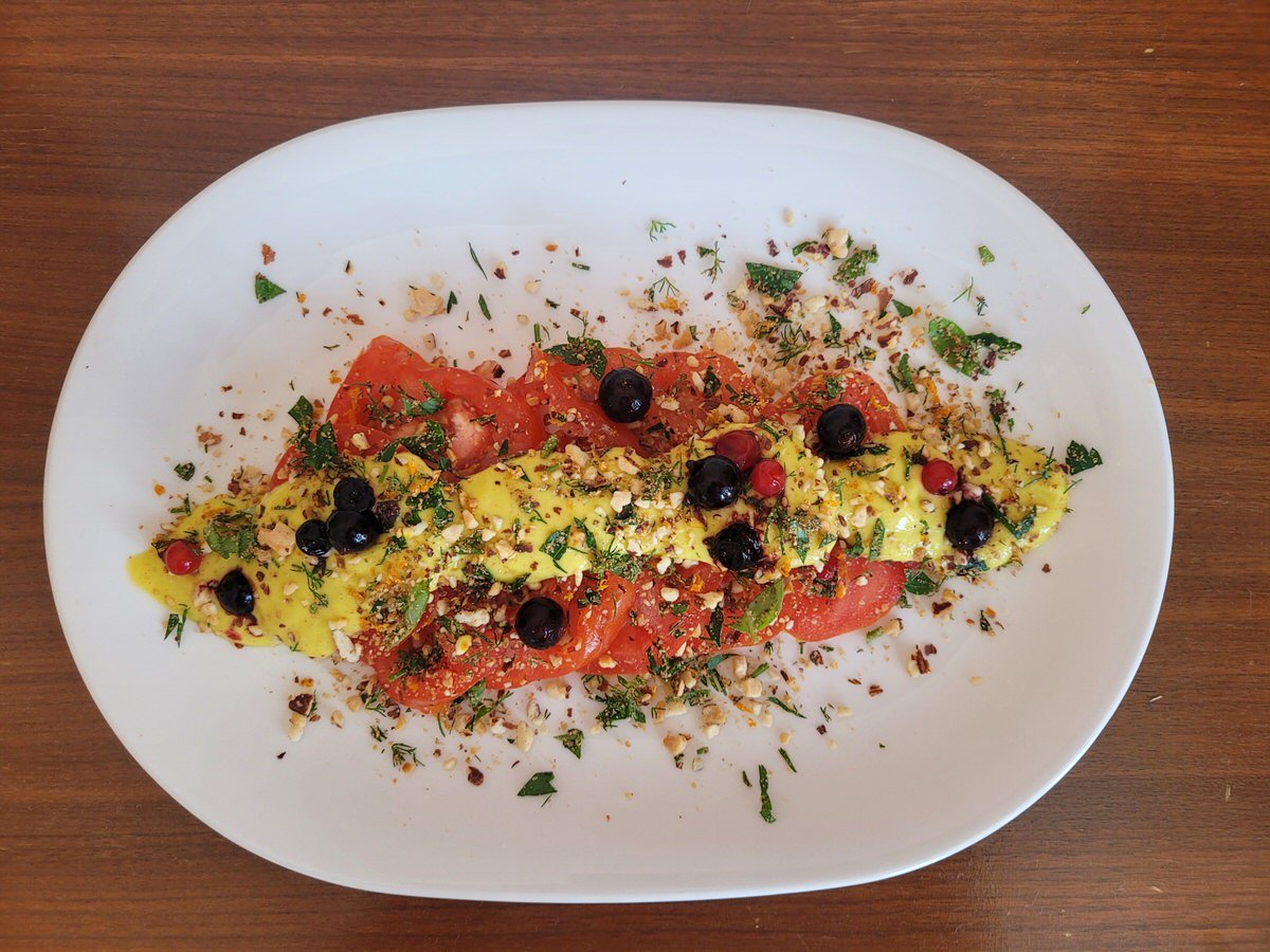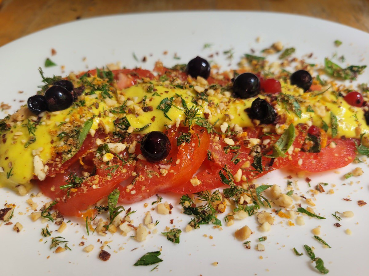 Was für eine herrliche Jahreszeit! Die ersten aromatischen Tomaten & dazu all die guten frischen Kräuter! Nimmt man dann noch meine Liebe zu Italien und der italienischen Küche dazu, ist das Tomaten-Carpaccio nicht weit. Weil Tomaten und Mango so gut zusammenpassen, gibt es dazu eine Mangosoße. Unkompliziert, weil es Mango rund ums Jahr tiefgekühlt gibt. Wer will, kann auch frische Pfirsiche oder Nektarinen benutzen. Diese fruchtige Mischung wird durch ein paar schwarze Johannisbeeren perfekt.